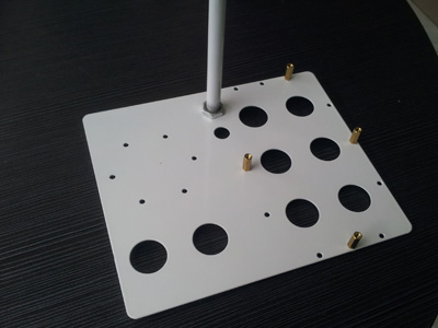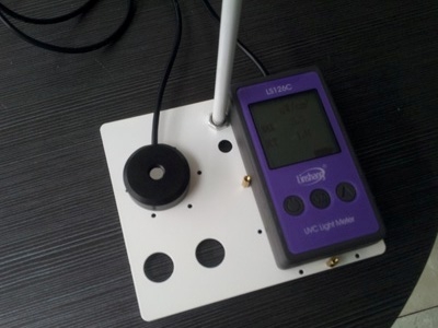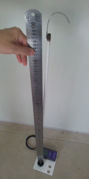? ? ?標尺掛鉤制作采用一根1m長的空心鐵管,一邊焊接一段鐵絲作為掛鉤,便于掛在紫外線燈管上。另一段用一塊厚1mm,寬140mm* 長170mm 的鐵板,作為放置儀器探頭和儀器的平臺。儀器的探頭上有磁鐵,可以吸在鐵板上,鐵板上固定幾顆銅柱,以便固定儀器,不至于移動過程中儀器跌落。