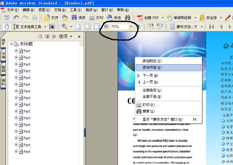 選擇好打開時需要顯示的圖的大小,如75%,100%等。然后在也需要創建的書簽的頁面上,擊右鍵,選擇“添加書簽”。需要添加的頁面,就會在左側顯示,然后在左側,修改需要顯示的書簽名字。